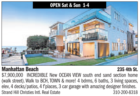 $7,900,000 INCREDIBLE New OCEAN VIEW south end sand section home (walk street). Walk to BCH, TOWN &more! 4bdrms,6baths, 3living spaces, elev, 4decks/patios,4f’places, 3car garage with amazing designer finishes. Strand Hill Christies Intl.Real Estate 310-200-8318