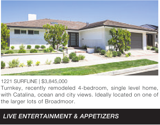 1221 SURFLINE | $3,845,000 Turnkey, recently remodeled 4-bedroom, single level home, with Catalina, ocean and city views. Ideally located on one of the larger lots of Broadmoor.