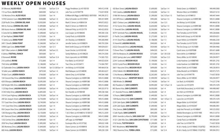 420 Bent Street, LAGUNA BEACH $1,699,000 Sat/Sun 1-4 Sheila Green, Lic #00836673 949.499.5900 1045 Catalina, LAGUNA BEACH $1,450,000 Sat/Sun 1-4 Winston West, Lic #01809833 949.637.6133 31906 9th Avenue, LAGUNA BEACH $1,399,000 Sat 2-5/Sun 1-5 Todd Davis, Lic#01969131 949.447.4444 234Cliff Drive2,LAGUNA BEACH $995,000 Sat/Sun 1-4 Shauna Covington, Lic#00991380 949.412.8088 26821 Chelsea Lane, LAGUNA HILLS $1,545,000 Sun 12-5 Jim Bishop, Lic #01352560 949.464.8136 31722Scenic Drive, LAGUNA NIGUEL $2,650,000 Sat/Sun 1-4 Shauna Covington, Lic #00991380 949.412.8088 11 Emerald Glen, LAGUNA NIGUEL $2,350,000 Sat/Sun 1-4 Shauna Covington, Lic #00991380 949.412.8088 30791Seminole Place, LAGUNA NIGUEL $1,399,000 Sun1-4 TomTomaiko, Lic#01753703 949.228.0606 21 Pacific Crest, LAGUNA NIGUEL $1,275,000 Sat12-3 Brett Smith Group, Lic #01365189 949.929.6351 31141 Doral Place, LAGUNA NIGUEL $1,188,000 Sun 1-3 Susan Helton, Lic #01854787 949.606.2330 35 Haverhill, LAGUNA NIGUEL $949,000 Sat 1-4 TomTomaiko, Lic#01753703 949.228.0606 23222 Cheswald Drive, LAGUNA NIGUEL $929,900 Sat/Sun1-4 TheOra Group, Lic #01210081 949.584.4466 73 DoverPlace73, LAGUNA NIGUEL $494,920 Sun 1-4 Cyndi Jones, Lic #02070588 859.421.6688 2393 ViaMariposa2A, LAGUNA WOODS $375,000 Sat1:30-3:30 StevedeVre, Lic #00893827 949.533.4010 22655Spring Lake Lane, LAKE FOREST $750,000 Sat/Sun12-5 SherryMiller, Lic #01189345 949.294.9977 22341Sunbrook, MISSION VIEJO $1,199,000 Sun1-4 Linda Huebner, Lic #00887400 949.581.2742 22232Crystal Pond, MISSIONVIEJO $1,149,000 Sun 1-4 Linda Huebner, Lic#00887400 949.581.2742 26611 Naccome Drive, MISSION VIEJO $699,000 Sun 1-4 RobertDiehl, Lic #01755868 949.230.9010 27652 Falkirk #89, MISSION VIEJO $580,000 Sat 1-4 Shiba Mostofi, Lic#01960418 949.973.7575 12 ViaMonarca, MONARCHBEACH $2,265,000 Sat/Sun 1-4 Julie Tran, Lic #01947778 714.657.8558 1815 WBay Avenue 1, NEWPORT BEACH $1,999,999 Sat/Sun 1-5 SherryMiller, Lic #01189345 949.294.9977 1808 Windes Dr, ORANGE $1,749,000 Sat/Sun 1-4 LocBack, Lic #01833955 714.227.2740 402 Pasadena Ct, SAN CLEMENTE $4,995,000 Sat 1-5/Sun 1-4 Laura Gin, Lic #0132570 949.370.1678 805 Buena Vista, SAN CLEMENTE $4,950,000 Sat 1-4 Scott Kidd |Associates|, Lic #01011063 949.498.0487 211Avenida Princesa, SAN CLEMENTE $2,200,000 Sat 1-4 Jen Holt, Lic #01978128 949.325.5472 10 Tesoro, SAN CLEMENTE $1,449,000 Sun 1-4 Shauna Covington, Lic #00991380 949.412.8088 1509 Buena Vista #102, SAN CLEMENTE $1,399,000 Sat 1-4/Sun 1-5 Laura Gin, Lic #0132570 949.370.1678 2239 Calle Opalo, SAN CLEMENTE $1,074,900 Sat 1-4 Megan Bixler, Lic #01433347 949.698.3901 2239 Calle Opalo, SAN CLEMENTE $1,049,900 Sat 1-4 Megan Bixler, Lic #01433347 949.698.3901 3Via Zamora, SAN CLEMENTE $895,000 Sat 1-4 Judy HartPerrault, Lic#01408647 949.525.0502 5Calle Tejado, SAN CLEMENTE $845,000 Sun 1-4 Debbie Brewington, Lic #01011900 949.212.0733 28581 Avenida La Mancha, SAN JUAN CAP $2,795,000 Sat/Sun 1-4 Shauna Covington, Lic #00991380 949.412.8088 31321 Calle Villa Clara, SAN JUAN CAPISTRANO $717,000 Sat 1-4 Candy Flock, Lic #00558789 949.584.6291 2192 Ventia, TUSTINRANCH $1,249,000 Sat 1-4 Julie Tran, Lic #01947778 714.657.8558 9931 Woodmere, WESTMINSTER $875,000 Sat 1-4 M. &A.Hardy, Lic#01190642 /01267922 949.584.3912 19822 Ravenna Drive, YORBA LINDA $712,000 Sat 12-4 M. &A.Hardy, Lic#01190642 /01267922 949.584.3912