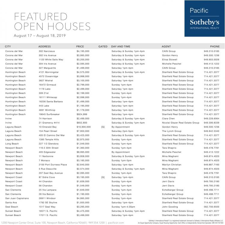 Laguna Beach 154 Pearl Street $7,950,000 Saturday 2pm-5pm The Lynch Group 949.842.5340