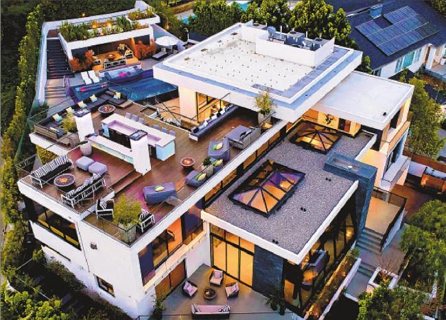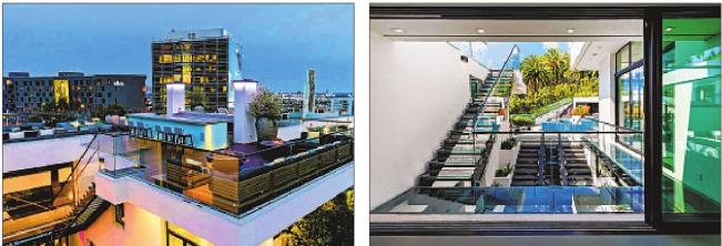 Massive skylights and glass walls that vary in height and depth give a high-rise-like quality to this contemporary residence above the Sunset Strip. A series of staircases and walkways, as well as an elevator, are used to navigate multiple outdoor living areas including a rooftop terrace with a full bar.