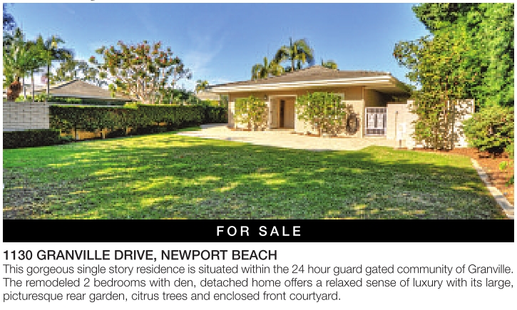FOR SALE 1130 GRANVILLE DRIVE, NEWPORT BEACH Thisgorgeoussingle story residenceissituated within the24hour guardgated communityofGranville. The remodeled 2 bedrooms with den, detached home offers a relaxed sense of luxury with its large, picturesque rear garden, citrus trees and enclosed front courtyard.