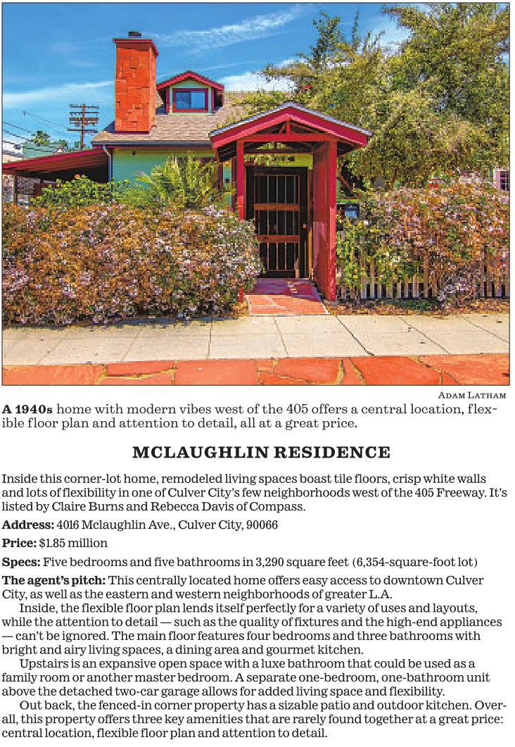 Inside this corner-lot home, remodeled living spaces boast tile floors, crisp white walls and lots of flexibility in one of Culver City’s few neighborhoods west of the 405 Freeway. It’s listed by Claire Burns and Rebecca Davis of Compass.