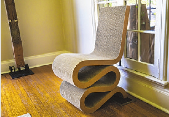 The polished bronze and stainless steel compression rocker is by Tarik Currimbhoy. There is a Frank Gehry Wiggle Chair made out of cardboard, and this spectacular console and coffee table are by Julio Betanco. For my wife’s birthday, I got her this Man Ray flat iron with nails that go through it. My wife does so much work for our family that I think it’s kind of a fun gesture to say this is not something that could ever be used for a utilitarian purpose.