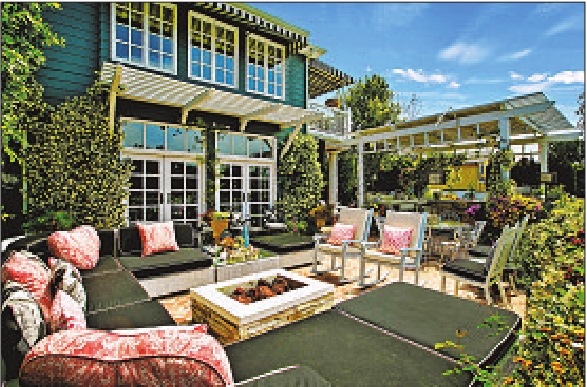 Out back, a terraced patio with afire pit descends to an entertainer’s yard with a swimming pool under hanging lights. Dense landscaping surrounds the space.