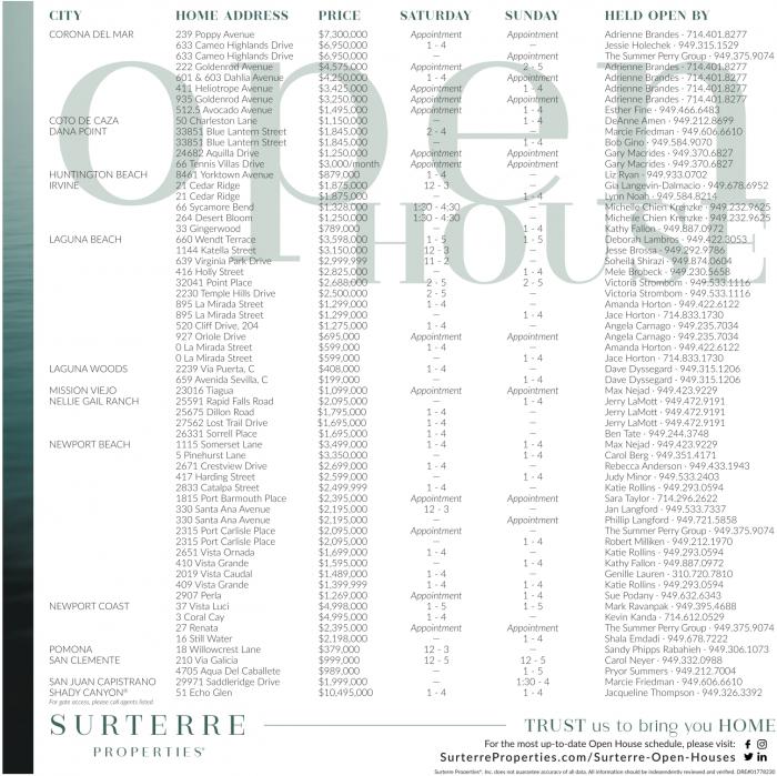 CORONA DEL MAR 239 PoppyAvenue $7,300,000 Appointment Appointment Adrienne Brandes · 714.401.8277 633 Cameo Highlands Drive $6,950,000 1 - 4 — Jessie Holechek · 949.315.1529 633 Cameo Highlands Drive $6,950,000 — Appointment The Summer PerryGroup · 949.375.9074 222 Goldenrod Avenue $4,575,000 Appointment 2 - 5 Adrienne Brandes · 714.401.8277 601 & 603 Dahlia Avenue $4,250,000 1 - 4 Appointment Adrienne Brandes · 714.401.8277 411 Heliotrope Avenue $3,425,000 Appointment 1 - 4 Adrienne Brandes · 714.401.8277 935 Goldenrod Avenue $3,250,000 Appointment Appointment Adrienne Brandes · 714.401.8277 512.5 Avocado Avenue $1,495,000 Appointment 1 - 4 Esther Fine · 949.466.6483 COTO DE CAZA 50 Charleston Lane $1,150,000 — 1 - 4 DeAnne Amen · 949.212.8699 DANA POINT 33851 Blue Lantern Street $1,845,000 2 - 4 — Marcie Friedman · 949.606.6610 33851 Blue Lantern Street $1,845,000 — 1 - 4 Bob Gino · 949.584.9070 24682 Aquilla Drive $1,250,000 Appointment Appointment Gary Macrides · 949.370.6827 66 Tennis Villas Drive $3,000/month Appointment Appointment Gary Macrides · 949.370.6827 HUNTINGTON BEACH 8461 Yorktown Avenue $879,000 1 - 4 — Liz Ryan · 949.933.0702 IRVINE 21 Cedar Ridge $1,875,000 12 - 3 — Gia Langevin-Dalmacio · 949.678.6952 21 Cedar Ridge $1,875,000 — 1 - 4 Lynn Noah · 949.584.8214 66 Sycamore Bend $1,328,000 1:30 - 4:30 — Michelle Chien Krenzke · 949.232.9625 264 Desert Bloom $1,250,000 1:30 - 4:30 — Michelle Chien Krenzke · 949.232.9625 33 Gingerwood $789,000 — 1 - 4 Kathy Fallon · 949.887.0972 LAGUNA BEACH 660 Wendt Terrace $3,598,000 1 - 5 1 - 5 Deborah Lambros · 949.422.3053 1144 Katella Street $3,150,000 12 - 3 — Jesse Brossa · 949.292.9786 639 Virginia Park Drive $2,999,999 11 - 2 — Soheila Shirazi · 949.874.0604 416 Holly Street $2,825,000 — 1 - 4 Mele Brobeck · 949.230.5658 32041 Point Place $2,688,000 2 - 5 2 - 5 Victoria Strombom · 949.533.1116 2230 Temple Hills Drive $2,500,000 2 - 5 — Victoria Strombom · 949.533.1116 895 La Mirada Street $1,299,000 1 - 4 — Amanda Horton · 949.422.6122 895 La Mirada Street $1,299,000 — 1 - 4 Jace Horton · 714.833.1730 520 Cliff Drive, 204 $1,275,000 1 - 4 — Angela Carnago · 949.235.7034 927 Oriole Drive $695,000 Appointment Appointment Angela Carnago · 949.235.7034 0 La Mirada Street $599,000 1 - 4 — Amanda Horton · 949.422.6122 0 La Mirada Street $599,000 — 1 - 4 Jace Horton · 714.833.1730 LAGUNA WOODS 2239 Via Puerta, C $408,000 1 - 4 — Dave Dyssegard · 949.315.1206 659 Avenida Sevilla, C $199,000 — 1 - 4 Dave Dyssegard · 949.315.1206 MISSION VIEJO 23016 Tiagua $1,099,000 Appointment Appointment Max Nejad · 949.423.9229 NELLIE GAIL RANCH 25591 Rapid Falls Road $2,095,000 — 1 - 4 Jerry LaMott · 949.472.9191 25675 Dillon Road $1,795,000 1 - 4 — Jerry LaMott · 949.472.9191 27562 Lost Trail Drive $1,695,000 1 - 4 — Jerry LaMott · 949.472.9191 26331 Sorrell Place $1,695,000 1 - 4 — Ben Tate · 949.244.3748 NEWPORT BEACH 1115 Somerset Lane $3,499,000 1 - 4 1 - 4 Max Nejad · 949.423.9229 5 Pinehurst Lane $3,350,000 — 1 - 4 Carol Berg · 949.351.4171 2671 Crestview Drive $2,699,000 1 - 4 — Rebecca Anderson · 949.433.1943 417 Harding Street $2,599,000 — 1 - 4 Judy Minor · 949.533.2403 2833 Catalpa Street $2,499,999 1 - 4 — Katie Rollins · 949.293.0594 1815 Port Barmouth Place $2,395,000 Appointment Appointment Sara Taylor · 714.296.2622 330 Santa Ana Avenue $2,195,000 12 - 3 — Jan Langford · 949.533.7337 330 Santa Ana Avenue $2,195,000 — Appointment Phillip Langford · 949.721.5858 2315 Port Carlisle Place $2,095,000 Appointment — The Summer Perry Group · 949.375.9074 2315 Port Carlisle Place $2,095,000 — 1 - 4 Robert Milliken · 949.212.1970 2651 Vista Ornada $1,699,000 1 - 4 — Katie Rollins · 949.293.0594 410 Vista Grande $1,595,000 — 1 - 4 Kathy Fallon · 949.887.0972 2019 Vista Caudal $1,489,000 1 - 4 — Genille Lauren · 310.720.7810 409 Vista Grande $1,399,999 1 - 4 1 - 4 Katie Rollins · 949.293.0594 2907 Perla $1,269,000 Appointment 1 - 4 Sue Podany · 949.632.6343 NEWPORT COAST 37 Vista Luci $4,998,000 1 - 5 1 - 5 Mark Ravanpak · 949.395.4688 3 Coral Cay $4,995,000 1 - 4 — Kevin Kanda · 714.612.0529 27 Renata $2,395,000 Appointment Appointment The Summer PerryGroup · 949.375.9074 16 Still Water $2,198,000 — 1 - 4 Shala Emdadi · 949.678.7222 POMONA 18 Willowcrest Lane $379,000 12 - 3 — Sandy Phipps Rabahieh · 949.306.1073 SAN CLEMENTE 210 Via Galicia $999,000 12 - 5 12 - 5 Carol Neyer · 949.332.0988 4705 Aqua Del Caballete $989,000 — 1 - 5 Pryor Summers · 949.212.7004 SAN JUAN CAPISTRANO 29971 Saddleridge Drive $1,999,000 — 1:30 - 4 Marcie Friedman · 949.606.6610 SHADY CANYON ® 51 Echo Glen $10,495,000 1 - 4 1 - 4 Jacqueline Thompson · 949.326.3392