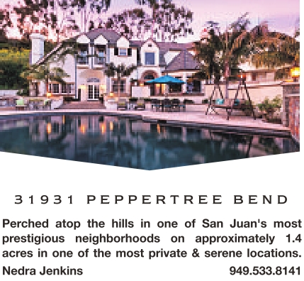 3 1 9 3 1 P E P P E R T R E E B E N D Perched atop the hills in one of San Juan's most prestigious neighborhoods on approximately 1.4 acres in one of the most private & serene locations. Nedra Jenkins 949.533.8141