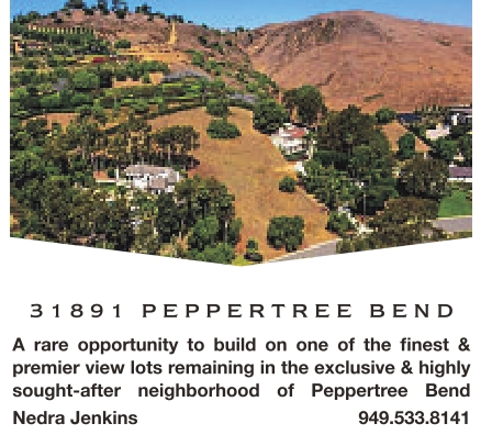 3 1 8 9 1 P E P P E R T R E E B E N D A rare opportunity to build on one of the finest & premier view lots remaining in the exclusive & highly sought-after neighborhood of Peppertree Bend Nedra Jenkins 949.533.8141