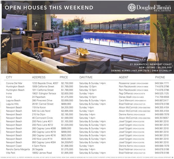 Corona Del Mar 1233 Bayside Drive, #207 $2,750,000 Saturday & Sunday 1-4pm Roseanne Levan DRE# 01044989 949.584.7771 Huntington Beach 1009 California Street $1,789,000 Saturday 12-3pm Roni Raczkowski DRE# 01119609 714.878.3796 Huntington Beach 1011 California Street $1,789,000 Saturday 12-3pm Roni Raczkowski DRE# 01119609 714.878.3796 Irvine 19021 Edington Terrace $2,600,000 Sunday 1-4pm Pegi DiRienzo DRE# 01219774 949.525.1125 Irvine 24 Paperbark $1,475,000 Saturday 12-3pm Danae Aballi DRE# 01414653 714.709.6558 Laguna Beach 390 Pinecrest Drive $3,699,000 Saturday & Sunday 1-4pm Carol Menconi DRE# 00855141 949.887.2417 Laguna Hills 26181 Carmel Street $689,900 Saturday & Sunday 1-4pm Brad Feldman DRE# 01437125 949.678.5198 Newport Beach 119 Via Koron $4,200,000 Sunday 1-4pm Alison McCormick DRE# 00607959 949.355.4104 Newport Beach 545 Via Lido Nord $3,995,000 Sunday 1-4pm Alison McCormick DRE# 00607959 949.355.4104 Newport Beach 215 Via Dijon $2,195,000 Saturday 1-4pm Denine Kerns DRE# 01248229 949.689.7078 Newport Beach 46 Cormorant Circle $1,589,000 Saturday 1-4pm Alison McCormick DRE# 00607959 949.357.8057 Newport Beach 200 Paris Lane #311 $1,100,000 Saturday & Sunday 1-4pm Josef Szigeti DRE# 01234785 949.981.3310 Newport Beach 200 Paris Lane #212 $1,029,000 Saturday & Sunday 1-4pm Josef Szigeti DRE# 01234785 949.981.3310 Newport Beach 260 Cagney Lane #308 $999,000 Saturday & Sunday 1-4pm Josef Szigeti DRE# 01234785 949.981.3310 Newport Beach 260 Cagney Lane #219 $899,000 Saturday & Sunday 1-4pm Josef Szigeti DRE# 01234785 949.981.3310 Newport Beach 260 Cagney Lane #216 $625,000 Saturday & Sunday 1-4pm Josef Szigeti DRE# 01234785 949.981.3310 Newport Beach 240 Nice Lane #114 $535,000 Saturday & Sunday 1-4pm Josef Szigeti DRE# 01234785 949.981.3310 Newport Beach 950 Cagney Lane #304 $4,200/MO Saturday & Sunday 1-4pm Josef Szigeti DRE# 01234785 949.981.3310 Newport Coast 4 Saint Pierre $1,998,000 Sunday 1-4pm Denine Kerns DRE# 01248229 949.689.7078 Rancho Santa Margarita 26 Segada $1,075,000 Saturday 1-4pm Brad Feldman DRE# 01437125 949.678.5198 Villa Park 18052 James Road $1,895,000 Saturday & Sunday 1-4pm Brad Feldman DRE# 01437125 949.678.5198