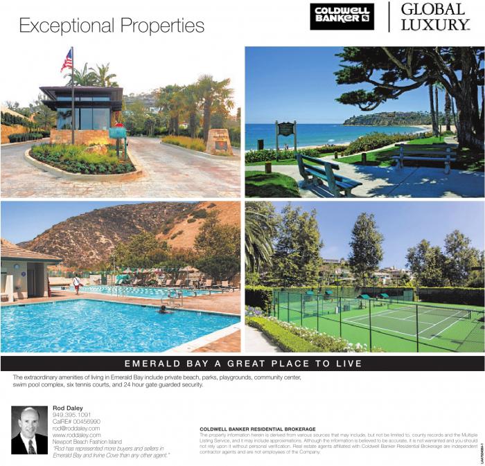 Exceptional Properties E M E R A L D B A Y A G R E A T P L A C E T O L I V E The extraordinary amenities of living in Emerald Bay include private beach, parks, playgrounds, community center, swim pool complex, six tennis courts, and 24 hour gate guarded security. Rod Daley 949.395.1091 CalRE# 00456990 rod@roddaley.com www.roddaley.com Newport Beach Fashion Island “Rod has represented more buyers and sellers in Emerald Bay and Irvine Cove than any other agent.” COLDWELL BANKER RESIDENTIAL BROKERAGE The property information herein is derived from various sources that may include, but not be limited to, county records and the Multiple Listing Service, and itmay include approximations. Although the information is believed to be accurate, it is not warranted and you should not rely upon it without personal verification. Real estate agents affiliated with Coldwell Banker Residential Brokerage are independent contractor agents and are not employees of the Company.