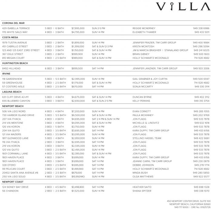 506 VIA LIDO NORD 4 BED | 4 BATH $7,200,000 SUN 1-4 PM EVAN CORKETT 949 285 1055 730 HARBOR ISLAND DRIVE 5 BED | 5.5 BATH $6,500,000 SAT & SUN 1-4 PM PAULA MCKINNEY 949 202 9769 207 VIA ITHACA 4 BED | 4 BATH $4,695,000 SAT 2-4 PM & SUN 1-4 PM JON FLAGG 949 533 7878 214 VIA MENTONE 3 BED | 4 BATH $4,095,000 SAT & SUN 1-4 PM MICHELLE Q. LINOVITZ 949 632 1618 126 VIA KORON 3 BED | 5 BATH $3,750,000 SUN 1-4 PM JON FLAGG 949 533 7878 204 VIA QUITO 3 BED | 3.5 BATH $3,695,000 SAT 1-4 PM KARA DUFFY, TIM CARR GROUP 949 433 6156 121 VIA WAZIERS 4 BED | 3.5 BATH $3,095,000 SUN 1-4 PM JON FLAGG 949 533 7878 1817 GLENWOOD LANE 5 BED | 4 BATH $2,850,000 SUN 1-4 PM STELLINO HASSEL TEAM 949 422 6661 116 VIA ITHACA 2 BED | 3 BATH $2,695,000 SAT 1-4 PM JON FLAGG 949 533 7878 219 VIA KORON 3 BED | 3 BATH $2,595,000 SUN 1-4 PM JON FLAGG 949 533 7878 120 VIA QUITO 3 BED | 2.5 BATH $2,495,000 SUN 1-4 PM JON FLAGG 949 533 7878 1601 CORNWALL LANE 4 BED | 3.5 BATH $2,395,000 SAT & SUN 1-4 PM JON FLAGG 949 533 7878 1801 HAVEN PLACE 4 BED | 3 BATH $1,699,000 SUN 1-4 PM KARA DUFFY, TIM CARR GROUP 949 433 6156 1801 HAVEN PLACE 4 BED | 3 BATH $1,699,000 SAT 1-4 PM JEANNE CARNI, TIM CARR GROUP 949 230 0879 328 OTERO 3 BED | 2.5 BATH $1,695,000 SAT 1-4 PM DEBBIE JOHNSON 949 278 1774 99 PELICAN COURT 3 BED | 2.5 BATH $1,499,900 SAT 1-4 PM HOLLY SCHWARTZ MCDONALD 714 928 4682 20402 SANTA ANA AVENUE #8 2 BED | 2.5 BATH $679,000 SAT 1-4 PM MINDA BUSH 949 280 5850 250 VIA LIDO SOUD 4 BED | 3.5 BATH $10,950/MO. SUN 1-4 PM OLGA MATTHEWS 949 922 5577