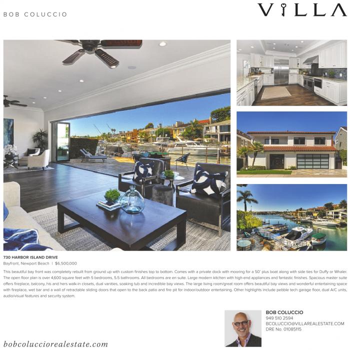 B O B C O L U C C I O 730 HARBOR ISLAND DRIVE Bayfront, Newport Beach | $6,500,000 This beautiful bay front was completely rebuilt from ground up with custom finishes top to bottom. Comes with a private dock with mooring for a 50’ plus boat along with side ties for Duffy or Whaler. The open floor plan is over 4,600 square feet with 5 bedrooms, 5.5 bathrooms. All bedrooms are en suite. Large modern kitchen with high-end appliances and fantastic finishes. Spacious master suite offers fireplace, balcony, his and hers walk-in closets, dual vanities, soaking tub and incredible bay views. The large living room/great room offers beautiful bay views and wonderful entertaining space with fireplace, wet bar and a wall of retractable sliding doors that open to the back patio and fire pit for indoor/outdoor entertaining. Other highlights include pebble tech garage floor, dual A/C units, audio/visual features and security system. BOB COLUCCIO 949 510 2594 BCOLUCCIO@VILLAREALESTATE.COM DRE No. 01085115 bobcolucciorealestate.com