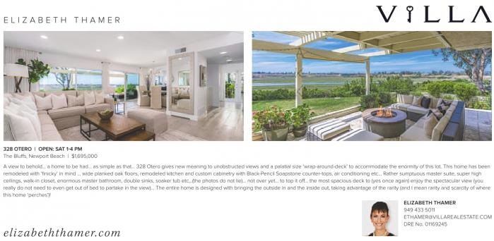 E L I Z A B E T H T H A M E R 328 OTERO | OPEN: SAT 1-4 PM The Bluffs, Newport Beach | $1,695,000 Aview to behold… ahome to be had… as simple as that… 328 Otero gives new meaning to unobstructed views and apalatial size ‘wrap-around-deck’ to accommodate the enormity of this lot. This home has been remodeled with ‘finicky’ in mind …wide planked oak floors, remodeled kitchen and custom cabinetry with Black-Pencil Soapstone counter-tops, air conditioning etc… Rather sumptuous master suite, super high ceilings, walk-in closet, enormous master bathroom, double sinks, soaker tub etc,..(the photos do not lie)... not over yet... to top it off... the most spacious deck to (yes once again) enjoy the spectacular view (you really do not need to even get out of bed to partake in the view)... The entire home is designed with bringing the outside in and the inside out, taking advantage of the rarity (and Imean rarity and scarcity of where this home ‘perches’)! ELIZABETH THAMER 949 433 5011 ETHAMER@VILLAREALESTATE.COM DRE No. 01169245 elizabeththamer.com