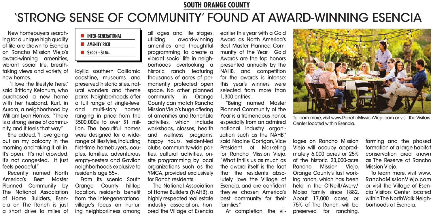 “Being named Master Planned Community of the Year is a tremendous honor, especially from an admired national industry organization such as the NAHB,” said Nadine Corrigan, Vice President of Marketing for Rancho Mission Viejo. “What thrills us as much as the award itself is the fact that the residents absolutely love the Village of Esencia, and are confident they’ve chosen America’s best community for their families.”