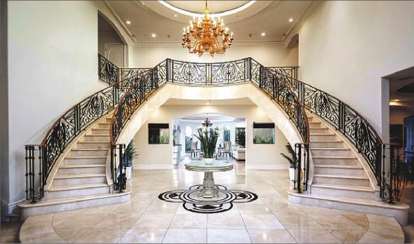 Spanning three stories above Lake Sherwood, the villa is awash in Old World details. A centerpiece great room features 2-foot-thick stone walls, beamed ceilings and flagstone floors. Saltillo tile floors accent the family room and kitchen. In the dining room, French doors open to a balcony overlooking the lake.