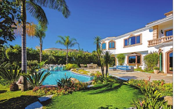 Aterrace tops the garages in the front. Out back, palm trees hang over a fountain-fed pool, patio and lawn.