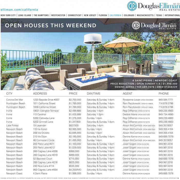 Corona Del Mar 1233 Bayside Drive #207 $2,750,000 Saturday & Sunday 1-4pm Roseanne Levan DRE# 01044989 949.584.7771 Huntington Beach 1011 California Street $1,789,000 Saturday & Sunday 1-4pm Roni Raczkowski DRE# 01119609 714.878.3796 Huntington Beach 1009 California Street $1,789,000 Saturday & Sunday 1-4pm Roni Raczkowski DRE# 01119609 714.878.3796 Irvine 19021 Edington Terrrace $2,499,888 Saturday 1-4pm Pegi DiRienzo DRE# 01219774 949.230.4663 Irvine 113 Cardinal $1,420,888 Saturday 1-3pm Debbie Marie DRE# 01837350 949.734.4680 Irvine 5392 Catowba Lane $1,375,000 Sunday 1-4pm Pegi DiRienzo DRE# 01219774 949.230.4663 Irvine 5202 Grinnell Lane $1,347,900 Saturday & Sunday 1-4pm Pegi DiRienzo DRE# 01219774 949.230.4663 Lake Forest 19 Lavender $827,500 Saturday 1-4pm Alison McCormick DRE# 00607959 949.357.8057 Newport Beach 119 Via Koron $3,995,000 Sunday 1-4pm Alison McCormick DRE# 00607959 949.355.4104 Newport Beach 208 Via Orvieto $3,695,000 Sunday 1-4pm Alison McCormick DRE# 00607959 949.355.4104 Newport Beach 215 Via Dijon $2,195,000 Saturday & Sunday 1-4pm Denine Kerns DRE# 01248229 949.689.7078 Newport Beach 46 Cormorant Circle $1,495,000 Sunday 1-4pm Alison McCormick DRE# 00607959 949.357.8057 Newport Beach 200 Paris Lane #311 $1,100,000 Saturday & Sunday 1-4pm Josef Szigeti DRE# 01234785 949.981.3310 Newport Beach 200 Paris Lane #212 $1,029,000 Saturday & Sunday 1-4pm Josef Szigeti DRE# 01234785 949.981.3310 Newport Beach 260 Cagney Lane #308 $999,000 Saturday & Sunday 1-4pm Josef Szigeti DRE# 01234785 949.981.3310 Newport Beach 260 Cagney Lane #219 $899,000 Saturday & Sunday 1-4pm Josef Szigeti DRE# 01234785 949.981.3310 Newport Beach 52 Baycrest Court $715,000 Saturday & Sunday 1-4pm Denine Kerns DRE# 01248229 949.689.7078 Newport Beach 260 Cagney Lane #216 $625,000 Saturday & Sunday 1-4pm Josef Szigeti DRE# 01234785 949.981.3310 Newport Beach 240 Nice Lane #114 $535,000 Saturday & Sunday 1-4pm Josef Szigeti DRE# 01234785 949.981.3310 Newport Beach 950 Cagney Lane #304 $4,200/MO Saturday & Sunday 1-4pm Josef Szigeti DRE# 01234785 949.981.3310 Newport Coast 4 Saint Pierre $1,998,000 Sunday 1-4pm Denine Kerns DRE# 01248229 949.689.7078