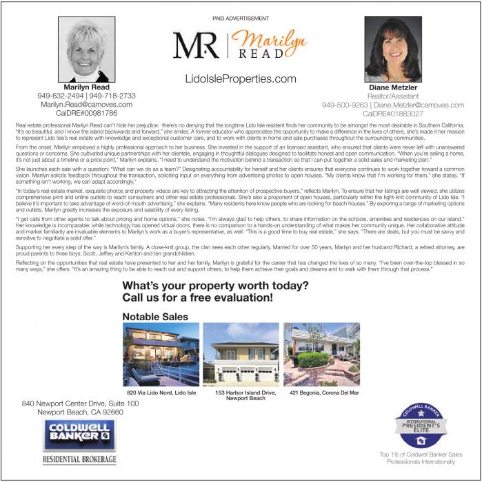 Real estate professional Marilyn Read can’t hide her prejudice: there’s no denying that the longtime Lido Isle resident finds her community to be amongst the most desirable in Southern California. “It’s so beautiful, and I know the island backwards and forward,” she smiles. A former educator who appreciates the opportunity to make a difference in the lives of others, she’s made it her mission to represent Lido Isle’s real estate with knowledge and exceptional customer care, and to work with clients in home and sale purchases throughout the surrounding communities.