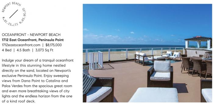OCEANFRONT - NEWPORT BEACH 1712 East Oceanfront, Peninsula Point 1712eastoceanfront.com | $8,175,000 4 Bed | 4.5 Bath | 3,073 Sq Ft Indulge your dream of a tranquil oceanfront lifestyle in this stunning home nestled directly on the sand, located on Newport’s exclusive Peninsula Point. Enjoy sweeping views from Dana Point to Catalina and Palos Verdes from the spacious great room and even more breathtaking views of city lights and the endless horizon from the one of a kind roof deck.
