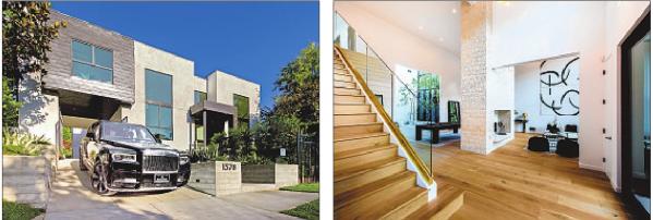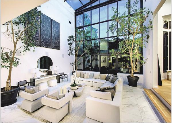Features: High ceilings; gallery walls; hardwood floors; step-down living room; formal dining room; chef’s kitchen with Calacatta gold countertops; multi-room master suite; separate guest quarters; swimming pool; sun deck; motor court