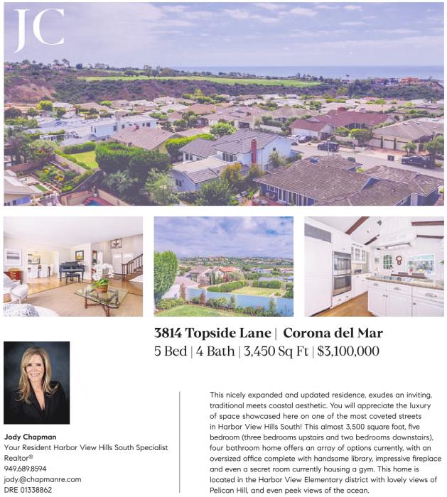 3814 Topside Lane | Corona del Mar 5 Bed | 4 Bath | 3,450 Sq Ft | $3,100,000 Jody Chapman Your Resident Harbor View Hills South Specialist Realtor ® 949.689.8594 jody.@chapmanre.com DRE 01338862 This nicely expanded and updated residence, exudes an inviting, traditional meets coastal aesthetic. You will appreciate the luxury of space showcased here on one of the most coveted streets in Harbor View Hills South! This almost 3,500 square foot, five bedroom (three bedrooms upstairs and two bedrooms downstairs), four bathroom home offers an array of options currently, with an oversized office complete with handsome library, impressive fireplace and even a secret room currently housing a gym. This home is located in the Harbor View Elementary district with lovely views of Pelican Hill, and even peek views of the ocean.