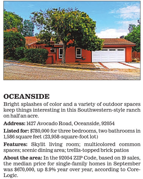 OCEANSIDE Bright splashes of color and a variety of outdoor spaces keep things interesting in this Southwestern-style ranch on half an acre. Address: 1427 Avocado Road, Oceanside, 92054 Listed for: $780,000 for three bedrooms, two bathrooms in 1,586 square feet (23,958-square-foot lot) Features: Skylit living room; multicolored common spaces; scenic dining area; trellis-topped brick patios About the area: In the 92054 ZIP Code, based on 19 sales, the median price for single-family homes in September was $670,000, up 8.9% year over year, according to Core- Logic. See also