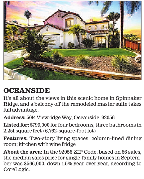 About the area: In the 92056 ZIP Code, based on 66 sales, the median sales price for single-family homes in September was $566,000, down 1.5% year over year, according to CoreLogic.
