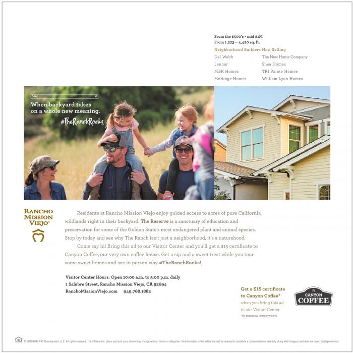 From the$500’s-mid $1M From 1,223–4,420 sq.ft. Neighborhood Builders Now Selling Del Webb TheNew Home Company Lennar Shea Homes MBK Homes TRI Pointe Homes Meritage Homes William Lyon Homes When backyard takes on a whole new meaning. Residents at Rancho Mission Viejo enjoy guided access to acres of pure California wildlands right in their backyard. The Reserve is a sanctuary of education and preservation for some of the Golden State’s most endangered plant and animal species. Stop by today and see why The Ranch isn’t just a neighborhood, it’s a naturehood. Come say hi! Bring this ad to our Visitor Center and you’ll get a $15 certificate to Canyon Coffee, our very own coffee house. Get a sip and a sweet treat while you tour some sweet homes and see in person why #TheRanchRocks! Visitor Center Hours: Open 10:00 a.m. to 5:00 p.m. daily 1 Salubre Street, Rancho Mission Viejo, CA 92694 RanchoMissionViejo.com 949.768.1882 Get a $15 certificate to Canyon Coffee* when you bring this ad to our Visitor Center *For prospectivehomebuyersonly. ©2019 RMV PA2 Development, LLC. All rights reserved. The information, plans and land uses shown may change without notice orobligation. Noinformationcontainedhereinshallbedeemed to constitutearepresentationorwarrantyofany kind.Imagery used does notdepictracial preference.