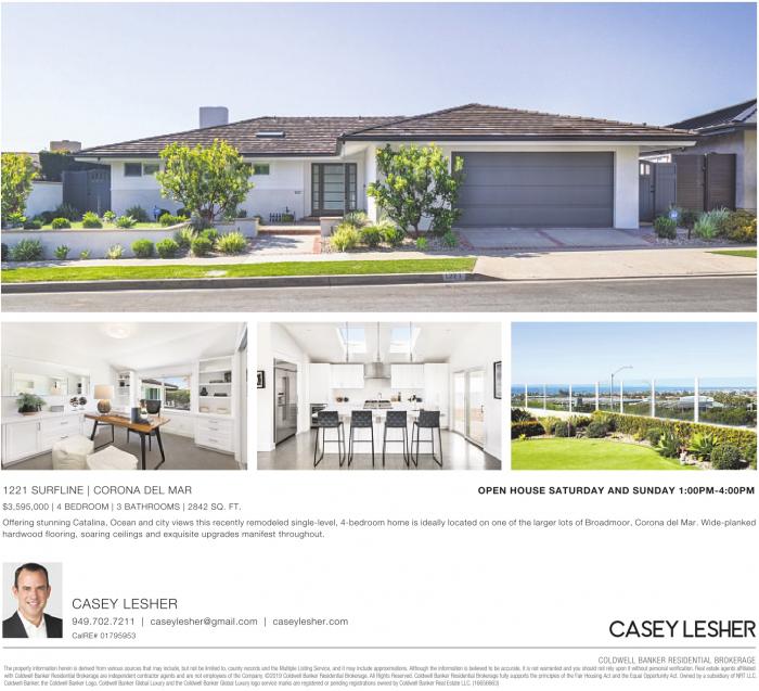 1221 SURFLINE | CORONA DEL MAR OPEN HOUSE SATURDAY AND SUNDAY 1:00PM-4:00PM $3,595,000 | 4 BEDROOM | 3 BATHROOMS | 2842 SQ. FT. Offering stunning Catalina, Ocean and city views this recently remodeled single-level, 4-bedroom home is ideally located on one of the larger lots of Broadmoor, Corona del Mar. Wide-planked hardwood flooring, soaring ceilings and exquisite upgrades manifest throughout. CASEY LESHER 949.702.7211 | caseylesher@gmail.com | caseylesher.com CalRE# 01795953 COLDWELL BANKER RESIDENTIAL BROKERAGE The property information herein is derived from various sources that may include, but not be limited to, county records and the Multiple Listing Service, and it may include approximations. Althoughthe information is believed to be accurate, it is not warranted and you should not rely upon it without personal verification. Real estate agents affiliated with Coldwell Banker Residential Brokerage are independent contractor agents and are not employees of the Company.©2019 Coldwell Banker Residential Brokerage. AllRights Reserved. Coldwell Banker Residential Brokerage fully supports the principles of the Fair Housing Act and the Equal Opportunity Act. Owned by asubsidiaryofNRT LLC. Coldwell Banker,the Coldwell Banker Logo, Coldwell Banker Global Luxuryand the Coldwell Banker Global Luxurylogo service marks are registered or pending registrations owned by Coldwell Banker Real Estate LLC. (16656663)
