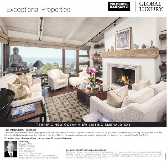 Exceptional Properties TERRIFIC NEW OCEAN VIEW LISTING EMERALD BAY 1019 EMERALD BAY | $7,200,000 The home represented on these two pages rests on the “new” hillside of Emerald Bay with panoramic ocean and canyon views. Main level features living, dining, master suite with office, terrific kitchen and ocean view deck for entertaining. Kitchen has granite counters and stainless steel appliances. Wake up to a view of Emerald Bay Beach. For online video, photos and brochure see www.1019emeraldbay.com Rod Daley 949.395.1091 CalRE# 00456990 rod@roddaley.com www.roddaley.com Newport Beach Fashion Island “Rod has represented more buyers and sellers in Emerald Bay and Irvine Cove than any other agent.” COLDWELL BANKER RESIDENTIAL BROKERAGE The property information herein is derived from various sources that may include, but not be limited to, county records and the Multiple Listing Service, and it may include approximations. Although the information is believed to be accurate, itisnot warranted and you should not rely upon it without personal verification. Real estate agents affiliated with Coldwell Banker Residential Brokerage are independent contractor agents and are not employees of the Company.