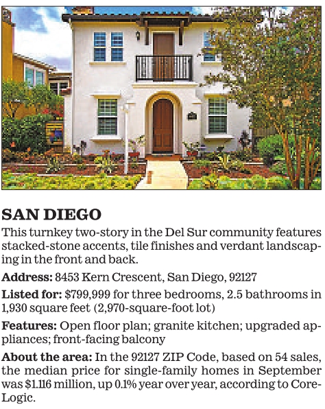 SAN DIEGO This turnkey two-story in the Del Sur community features stacked-stone accents, tile finishes and verdant landscaping in the front and back.