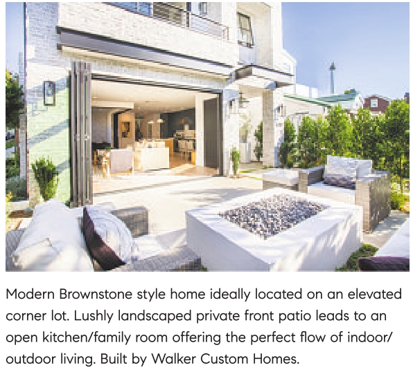 Modern Brownstone style home ideally located on an elevated corner lot. Lushly landscaped private front patio leads to an open kitchen/family room offering the perfect flow of indoor/ outdoor living. Built by Walker Custom Homes.