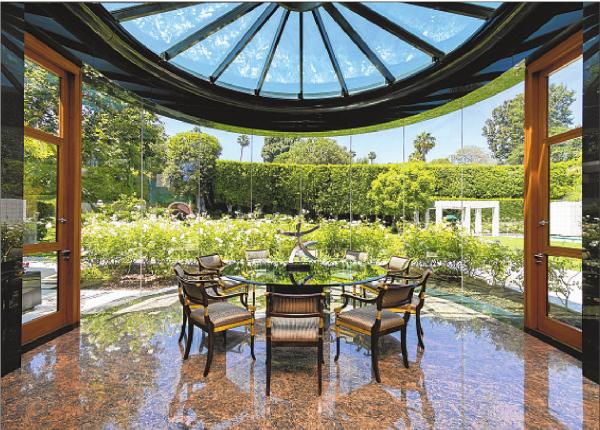Water cascades down a series of reflecting pools to mark the entrance of this modern mansion in Beverly Hills. The multilevel residence features a two-story glass atrium entry, scaled formal rooms and an indoor swimming pool. A so-called water lounge is bordered on all sides by ponds.