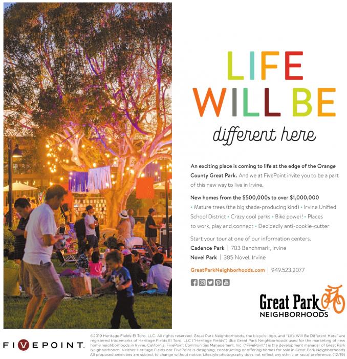 ©2019 Heritage Fields El Toro, LLC. All rights reserved. Great Park Neighborhoods, the bicycle logo, and “Life Will Be Different Here” are registered trademarks of Heritage Fields El Toro, LLC (“Heritage Fields”) dba Great Park Neighborhoods used for the marketing of new home neighborhoods inIrvine, California. FivePoint Communities Management, Inc. (“FivePoint”) is the development manager ofGreat Park Neighborhoods. Neither Heritage Fields nor FivePoint is designing, constructing or offering homes for sale in Great Park Neighborhoods.