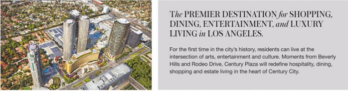 The PREMIER DESTINATION for SHOPPING, DINING, ENTERTAINMENT, and LUXURY LIVING in LOS ANGELES. For the first time in the city’s history, residents can live at the intersection of arts, entertainment and culture. Moments from Beverly Hills and Rodeo Drive, Century Plaza will redefine hospitality, dining, shopping and estate living in the heart of Century City.
