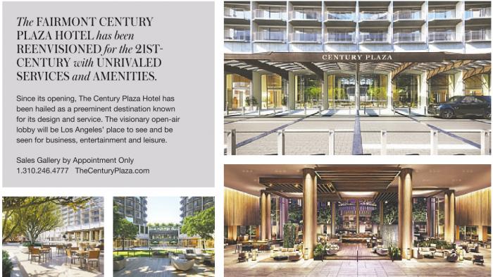 The FAIRMONT CENTURY PLAZA HOTEL has been REENVISIONED for the 21ST- CENTURY with UNRIVALED SERVICES and AMENITIES. Since its opening, The Century Plaza Hotel has been hailed as a preeminent destination known for its design and service. The visionary open-air lobby will be Los Angeles’ place to see and be seen for business, entertainment and leisure. Sales Gallery by Appointment Only 1.310.246.4777 TheCenturyPlaza.com