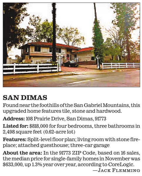 SAN DIMAS Found near the foothills of the San Gabriel Mountains, this upgraded home features tile, stone and hardwood. Address: 108 Prairie Drive, San Dimas, 91773 Listed for: $818,000 for four bedrooms, three bathrooms in 2,498 square feet (0.62-acre lot) Features: Split-level floor plan; living room with stone fireplace; attached guesthouse; three-car garage About the area: In the 91773 ZIP Code, based on 16 sales, the median price for single-family homes in November was $633,000, up 1.3% year over year, according to CoreLogic. —Jack Flemming