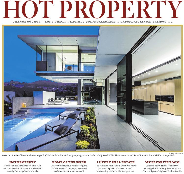 HOT PROPERT Y ORANGE COUNTY :: LONG BEACH :: LATIMES.COM/REALESTATE :: SATURDAY, JANUARY 11, 2020 :: J Aaron Hoffman NBA PLAYER Chandler Parsons paid $6.775 million for an L.A. property, above, in the Hollywood Hills. He also cut a $9.25-million deal for a Malibu compound. HOT PROPERTY A home linked to television’s Dr. Phil, with an eclectic interior, is outlandish even by Los Angeles standards. HOME OF THE WEEK A 1929 Beverly Hills estate designed by Wallace Neff displays the famed architect’s attention to detail. LUXURY REAL ESTATE Los Angeles’ high-end market will show moderate price increases in 2020, amounting to about 2%, analysts say. MY FAVORITE ROOM Actress Erinn Hayes’ converted carriage house in Highland Park is a “catchall peaceful place” for her family.