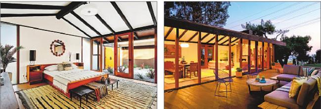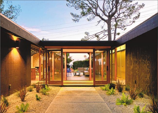 Unassuming from the street, this Midcentury Modern home leaves little to the imagination inside with an atrium entry and two glass-walled wings that look onto a large outdoor deck. Recently renovated, the post-andbeam residence is one of only 32 homes designed by architect James Allen Walter.