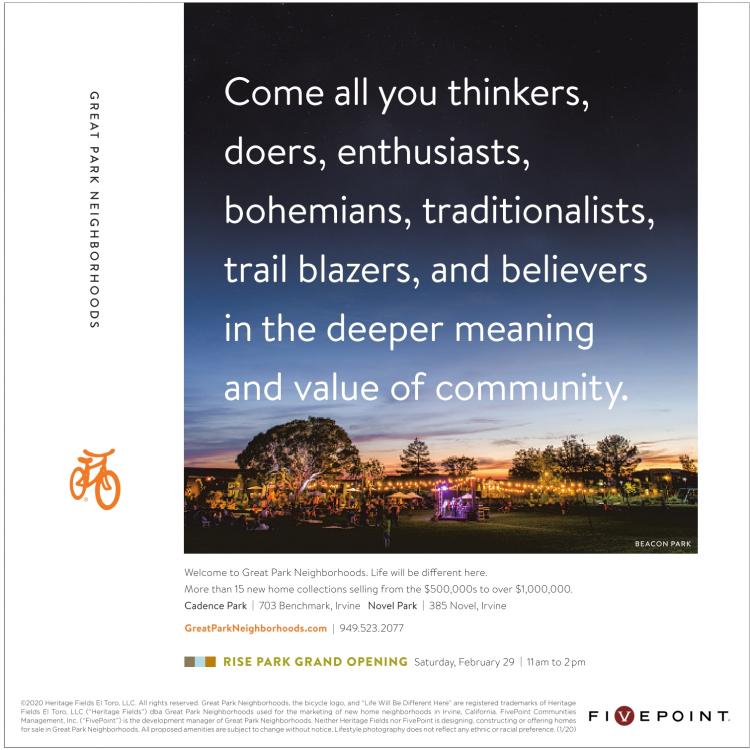 ©2020 Heritage Fields El Toro, LLC. All rights reserved. Great Park Neighborhoods, the bicycle logo, and “Life Will Be Different Here” are registered trademarks of Heritage Fields El Toro, LLC (“Heritage Fields”) dba Great Park Neighborhoods used for the marketing of new home neighborhoods in Irvine, California. FivePoint Communities Management, Inc. (“FivePoint”) is the development manager of Great Park Neighborhoods. Neither Heritage Fields nor FivePoint isdesigning, constructing oroffering homes forsaleinGreat Park Neighborhoods. Allproposedamenities aresubject to change without notice.Lifestylephotography does notreflectany ethnic or racial preference. (1/20)