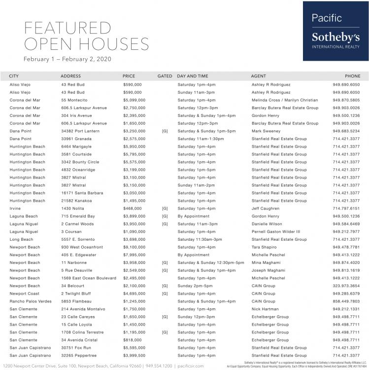 Newport Beach 1569 East Ocean Boulevard $2,495,000 Saturday 1pm-4pm Michelle Peschel 949.413.1222
