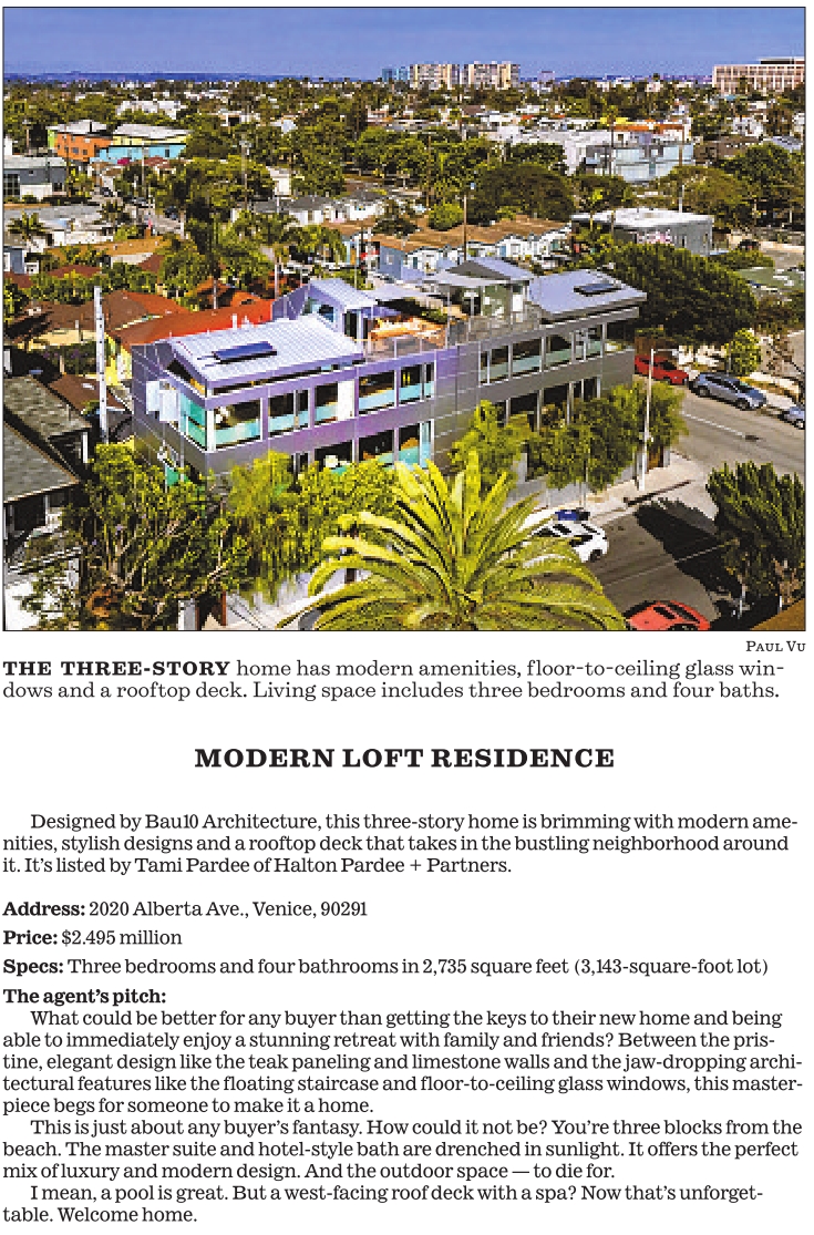 THE THREE-STORY home has modern amenities, floor-to-ceiling glass windows and a rooftop deck. Living space includes three bedrooms and four baths. Paul Vu MODERN LOFT RESIDENCE Designed by Bau10 Architecture, this three-story home is brimming with modern amenities, stylish designs and a rooftop deck that takes in the bustling neighborhood around it. It’s listed by Tami Pardee of Halton Pardee + Partners. Address: 2020 Alberta Ave., Venice, 90291 Price: $2.495 million Specs: Three bedrooms and four bathrooms in 2,735 square feet (3,143-square-foot lot) The agent’s pitch: What could be better for any buyer than getting the keys to their new home and being able to immediately enjoy a stunning retreat with family and friends? Between the pristine, elegant design like the teak paneling and limestone walls and the jaw-dropping architectural features like the floating staircase and floor-to-ceiling glass windows, this masterpiece begs for someone to make it a home. This is just about any buyer’s fantasy. How could it not be? You’re three blocks from the beach. The master suite and hotel-style bath are drenched in sunlight. It offers the perfect mix of luxury and modern design. And the outdoor space — to die for. Imean, a pool is great. But a west-facing roof deck with a spa? Now that’s unforgettable. Welcome home.