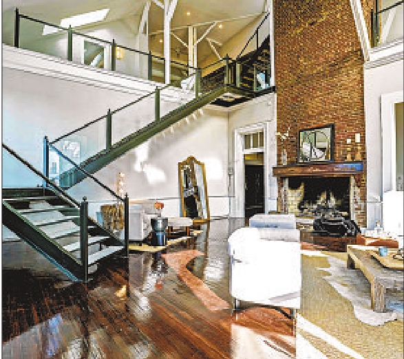 the heart of the penthouse is atwo-story lofted living room with abrick