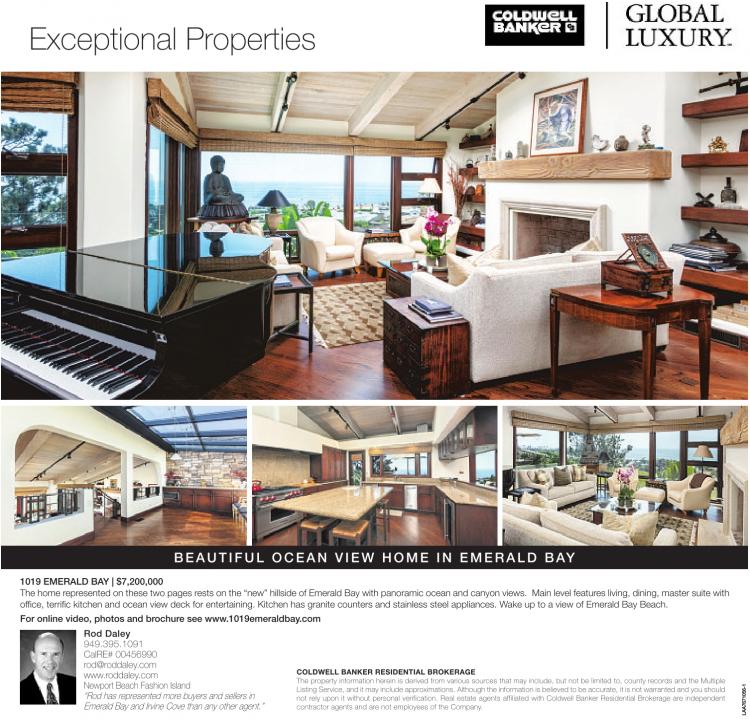 Exceptional Properties BEAUTIFUL OCEAN VIEW HOME IN EMERALD BAY 1019 EMERALD BAY | $7,200,000 The home represented on these two pages rests on the “new” hillside of Emerald Bay with panoramic ocean and canyon views. Main level features living, dining, master suite with office, terrific kitchen and ocean view deck for entertaining. Kitchen has granite counters and stainless steel appliances. Wake up to a view of Emerald Bay Beach. For online video, photos and brochure see www.1019emeraldbay.com Rod Daley 949.395.1091 CalRE# 00456990 rod@roddaley.com www.roddaley.com Newport Beach Fashion Island “Rod has represented more buyers and sellers in Emerald Bay and Irvine Cove than any other agent.” COLDWELL BANKER RESIDENTIAL BROKERAGE The property information herein is derived from various sources that may include, but not be limited to, county records and the Multiple Listing Service, and it may include approximations. Although the information is believed to be accurate, itisnot warranted and you should not rely upon it without personal verification. Real estate agents affiliated with Coldwell Banker Residential Brokerage are independent contractor agents and are not employees of the Company.