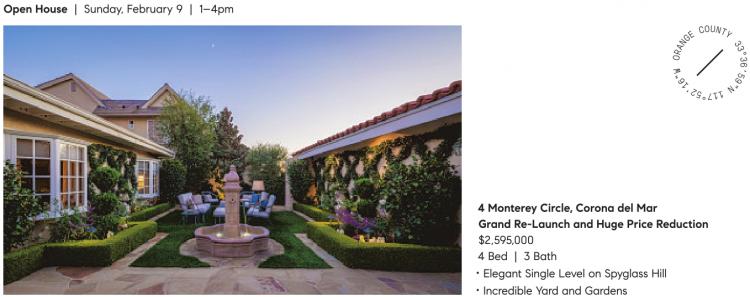 4 Monterey Circle, Corona del Mar Grand Re-Launch and Huge Price Reduction $2,595,000 4 Bed | 3 Bath • Elegant Single Level on Spyglass Hill • Incredible Yard and Gardens