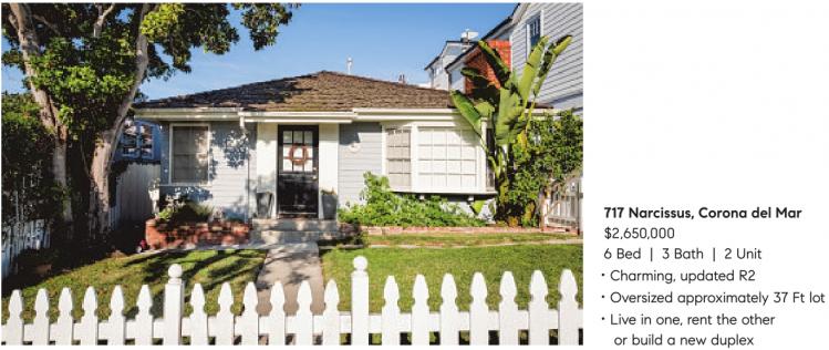 717 Narcissus, Corona del Mar $2,650,000 6 Bed | 3 Bath | 2 Unit • Charming, updated R2 • Oversized approximately 37 Ft lot • Live in one, rent the other or build a new duplex
