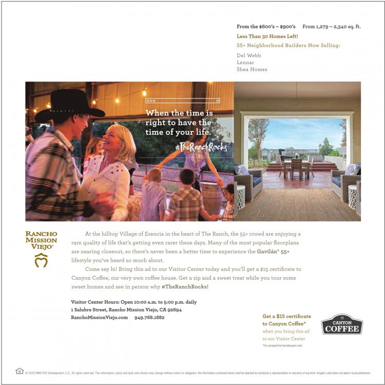From the $600’s – $900’s From 1,279 – 2,340 sq. ft. Less Than 30 Homes Left! 55+ Neighborhood Builders Now Selling: Del Webb Lennar Shea Homes When the time is right to have the time of your life. At the hilltop Village of Esencia in the heart of The Ranch, the 55+ crowd are enjoying a rare quality of life that’s getting even rarer these days. Many of the most popular floorplans are nearing closeout, so there’s never been a better time to experience the Gavilán® 55+ lifestyle you’ve heard so much about. Come say hi! Bring this ad to our Visitor Center today and you’ll get a $15 certificate to Canyon Coffee, our very own coffee house. Get a sip and a sweet treat while you tour some sweet homes and see in person why #TheRanchRocks! Visitor Center Hours: Open 10:00 a.m. to 5:00 p.m. daily 1 Salubre Street, Rancho Mission Viejo, CA 92694 RanchoMissionViejo.com 949.768.1882 Get a $15 certificate to Canyon Coffee* when you bring this ad to our Visitor Center *For prospectivehomebuyersonly. ©2020 RMVPA2 Development, LLC. All rights reserved. The information, plans and land uses shown may change without notice or obligation. Noinformationcontainedhereinshall be deemedtoconstitutearepresentationorwarrantyofany kind.Imagery used does notdepictracialpreference.