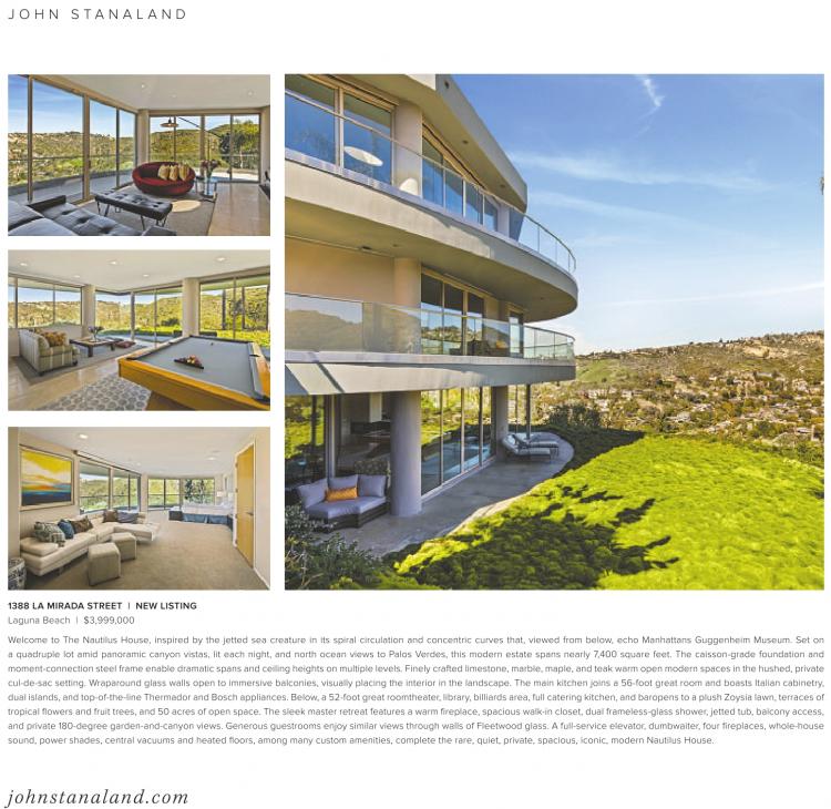 Welcome to The Nautilus House, inspired by the jetted sea creature in its spiral circulation and concentric curves that, viewed from below, echo Manhattans Guggenheim Museum. Set on a quadruple lot amid panoramic canyon vistas, lit each night, and north ocean views to Palos Verdes, this modern estate spans nearly 7,400 square feet. The caisson-grade foundation and moment-connection steel frame enable dramatic spans and ceiling heights on multiple levels. Finely crafted limestone, marble, maple, and teak warm open modern spaces in the hushed, private cul-de-sac setting. Wraparound glass walls open to immersive balconies, visually placing the interior in the landscape. The main kitchen joins a 56-foot great room and boasts Italian cabinetry, dual islands, and top-of-the-line Thermador and Bosch appliances. Below,a52-foot great roomtheater,library,billiards area, full catering kitchen, and baropens to aplush Zoysia lawn, terraces of tropical flowers and fruit trees, and 50 acres of open space. The sleek master retreat features a warm fireplace, spacious walk-in closet, dual frameless-glass shower, jetted tub, balcony access, and private 180-degree garden-and-canyon views. Generous guestrooms enjoy similar views through walls of Fleetwood glass. A full-service elevator, dumbwaiter, four fireplaces, whole-house sound, power shades, central vacuums and heated floors, among many custom amenities, complete the rare, quiet, private, spacious, iconic, modern Nautilus House.