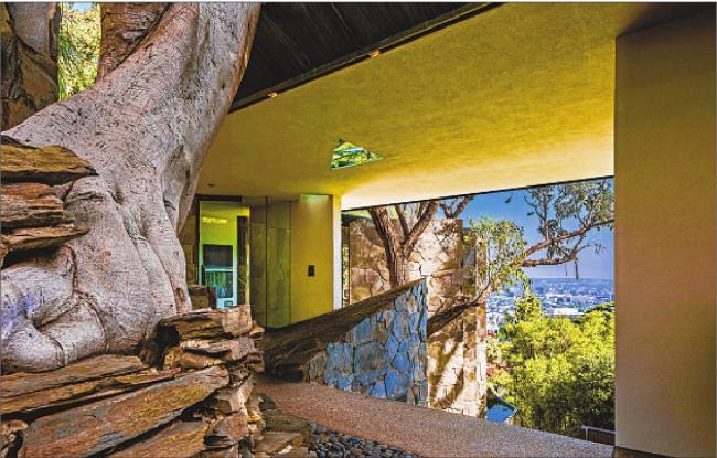The home, which extends upward against the hillside, has about 1,700 square feet of interior space, one bedroom, 1.5 bathrooms and a great room. The gleaming kitchen is outfitted with stainless steel cabinetry. An adjoining guesthouse, built in the 1970s, has three rooms, two bathrooms and about 1,170 square feet of space.