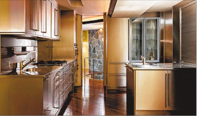 Aprivate elevator ascends to the suite, which holds a pair of bedrooms and bathrooms. Highlights include a compact kitchen under 18-foot ceilings and a sunny living room with a fireplace. In the dining area, a ladder accesses hard-to-reach cabinetry.